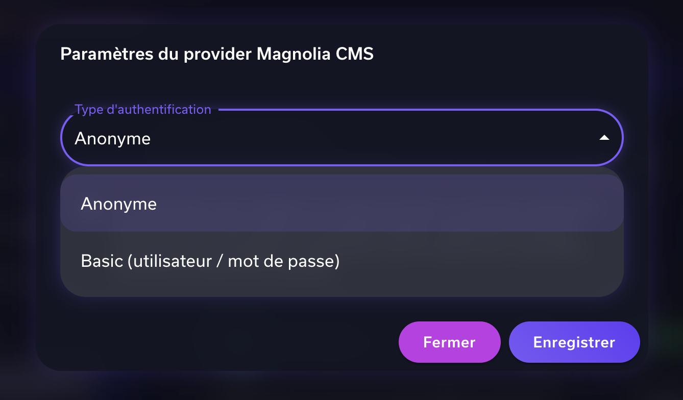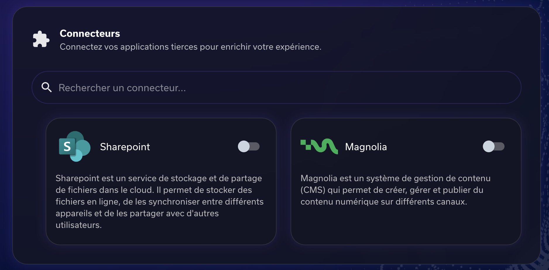 Dans Paramètres > Connecteurs, activez le connecteur Magnolia CMS.