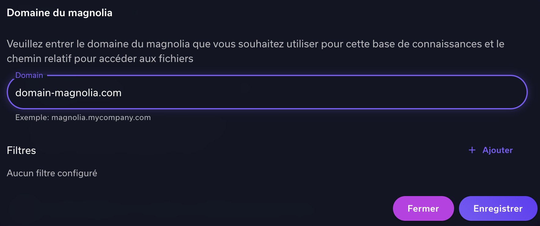 Lors de l'ajout du connecteur Magnolia sur une base de connaissances ou un agent, un dialogue vous demande de renseigner le domaine de votre instance Magnolia.