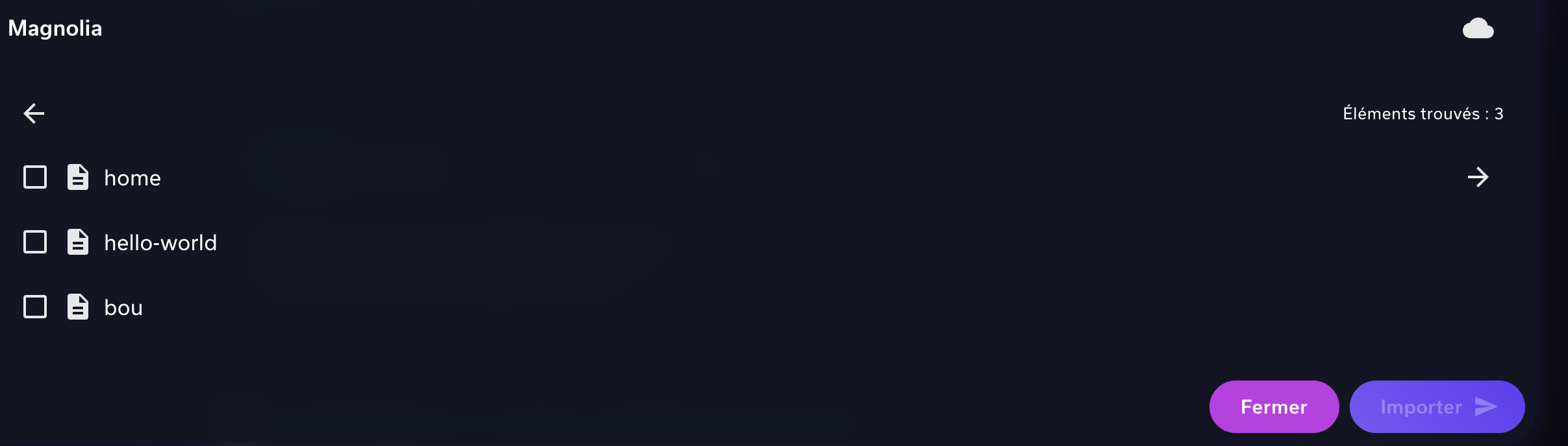 - Cochez les éléments que vous souhaitez importer dans votre base de connaissances